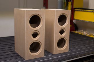 Раскрой корпусов произведен на ЧПУ станке по чертежам производителя, отверстия для динамиков с фрезеровкой под фланцы для установки заподлицо с передней панелью.