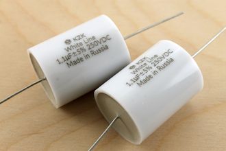 Конденсаторы KZK White Line 1.1 мкф 250В - новые пленочные неполярные полипропиленовые аудио конденсаторы для ВЧ динамиков кроссоверов акустических систем. Это обновленная версия популярных отечественных конденсаторов для фильтров акустики К78-34 250В. Подключение ВЧ динамиков через конденсатор производится последовательно, необходимая емкость конденсатора для нужной частоты среза подбирается по таблице.
