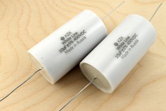 Конденсатор KZK White Line 10мкф 400В - новые пленочные полипропиленовые аудио конденсаторы для кроссоверов акустических систем, самодельных стереоусилителей. Настало время использовать отечественные комплектующие для производства акустики и аудио компонентов. Это обновленная версия популярных отечественных конденсаторов для фильтров акустики К78-34 400В. Могут использоваться как запчасти для акустических систем Magnat.