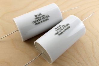 Конденсатор KZK White Line 13мкф 400В - новые пленочные полипропиленовые аудио конденсаторы для кроссоверов акустических систем, самодельных стереоусилителей. Настало время использовать отечественные комплектующие для производства акустики и аудио компонентов. Это обновленная версия популярных отечественных конденсаторов для фильтров акустики К78-34 400В. Могут использоваться как запчасти для акустических систем Technics, Pioneer.