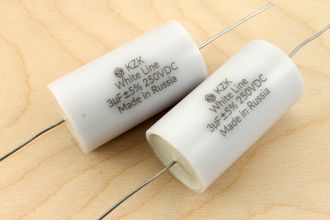 Конденсатор KZK White Line 3 мкф 250В - новые пленочные полипропиленовые аудио конденсаторы для кроссоверов акустических систем класса Hi-Fi и High End. Это обновленная версия популярных отечественных конденсаторов для фильтров акустики К78-34 250В. Без сомнения один из лучших вариантов конденсатора для фильтра ВЧ и ответ на вопрос "какой конденсатор поставить на ВЧ-динамик?".