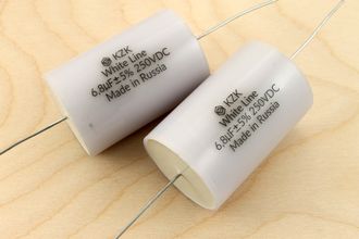 Конденсаторы KZK White Line 6.8 мкф 250В - пленочные неполярные полипропиленовые аудио конденсаторы для кроссоверов акустических систем, усилителей НЧ. Это обновленная версия популярных отечественных конденсаторов для фильтров акустики К78-34 250В. Конденсаторы успешно применяются в фильтрах НЧ второго порядка в акустике.