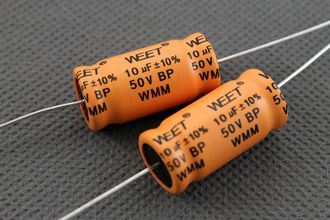 Биполярные электролитические конденсаторы WEET WMM для конструирования кроссоверов акустических систем и других аудио применений, часто используются в режекторных фильтрах, при недостатке места на плате кроссовера, неполярные электролиты значительно экономят бюджет, так как обладают превосходным соотношением емкость/цена. Низкий коэффициент потерь DF, макс. 5% на 1 кГц.