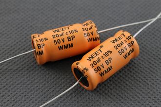 Биполярные электролитические конденсаторы WEET WMM для конструирования кроссоверов акустических систем и других аудио применений, часто используются в режекторных фильтрах, при недостатке места на плате кроссовера, неполярные электролиты значительно экономят бюджет, так как обладают превосходным соотношением емкость/цена. Низкий коэффициент потерь DF, макс. 5% на 1 кГц.