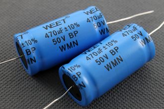 Биполярные электролитические конденсаторы WEET WMN для конструирования кроссоверов акустических систем и других аудио применений, часто используются в режекторных фильтрах, при недостатке места на плате кроссовера, неполярные электролиты значительно экономят бюджет, так как обладают превосходным соотношением емкость/цена. Низкий коэффициент потерь DF, макс. 5% на 120Гц.